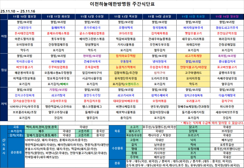 [이천하늘애한방병원 11월 1주차 주간식단표]