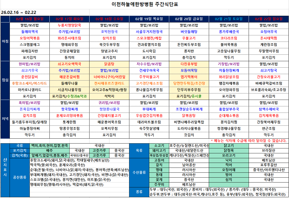 [이천하늘애한방병원 2월 3주차 주간식단표]