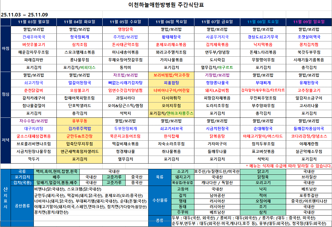2025년 8월 3주차 주간식단표