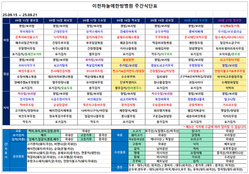 [이천하늘애한방병원 9월 3주차 주간식단표]