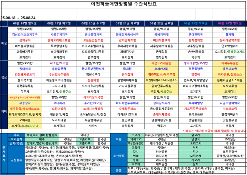[이천하늘애한방병원 8월 4주차 주간식단표]