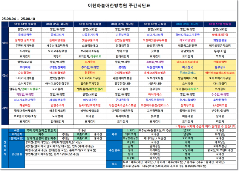 [이천하늘애한방병원 8월 2주차 주간식단표]