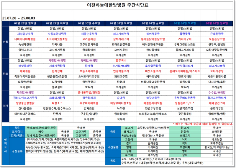 [이천하늘애한방병원 7월 5주 / 8월 1주차 주간식단표]