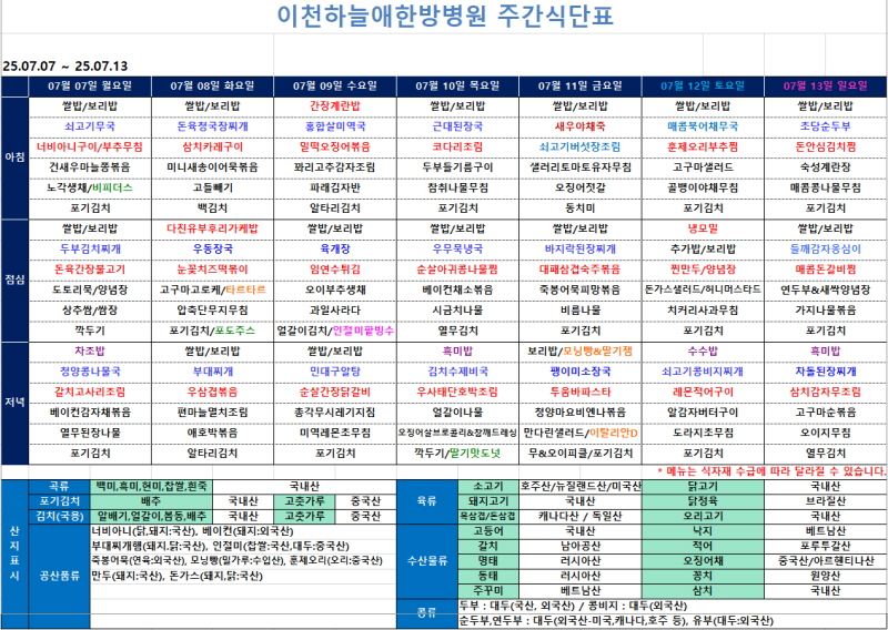 [이천하늘애한방병원 7월 2주차 주간식단표]