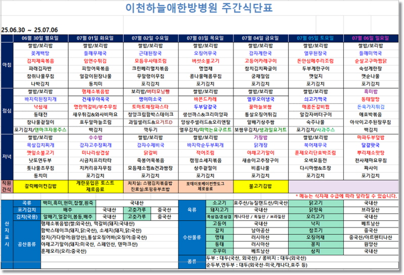 [이천하늘애한방병원 7월 1주차 주간식단표]