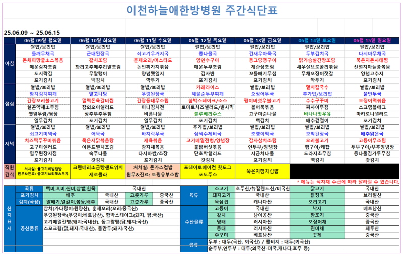 [이천하늘애한방병원 6월 2주차 주간식단표]