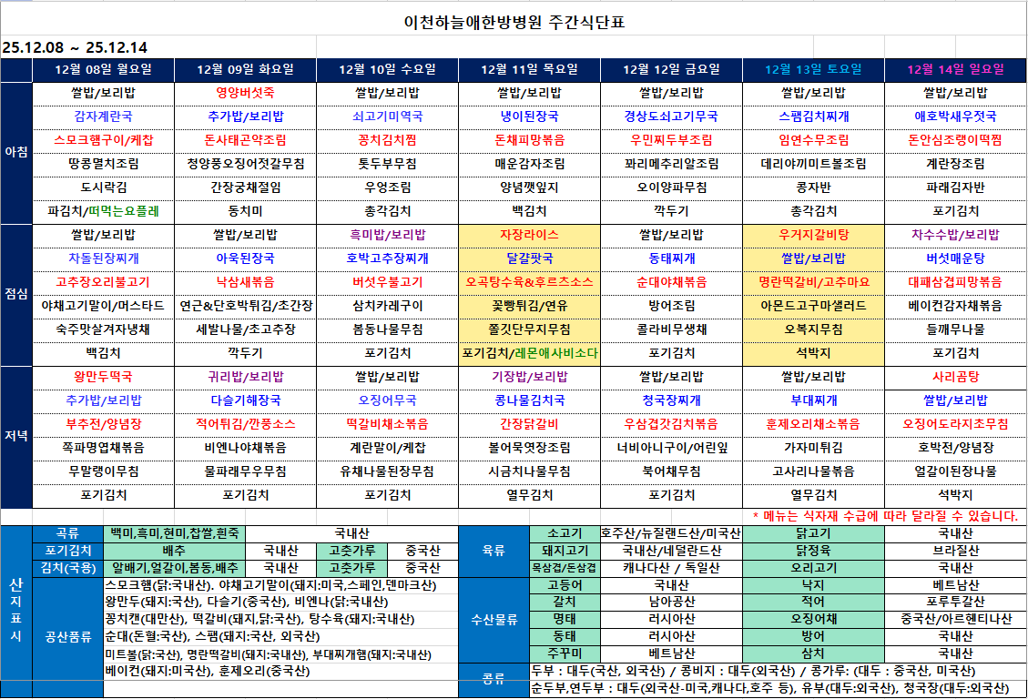 [이천하늘애한방병원 12월 2주차 주간식단표]